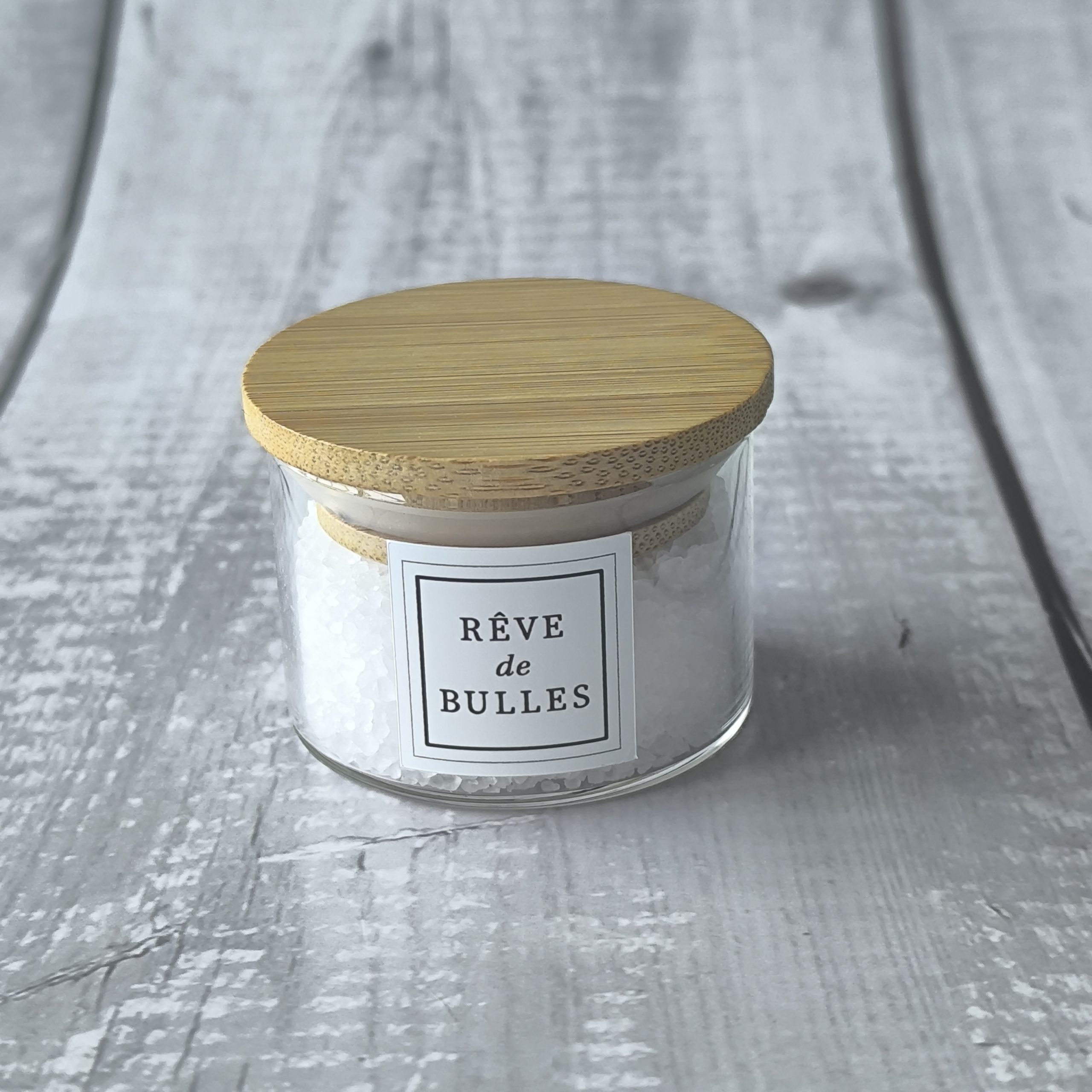 Pot en borosilicate avec 40g de sels de bain détente. Re-remplissable avec le sel de bain en vrac