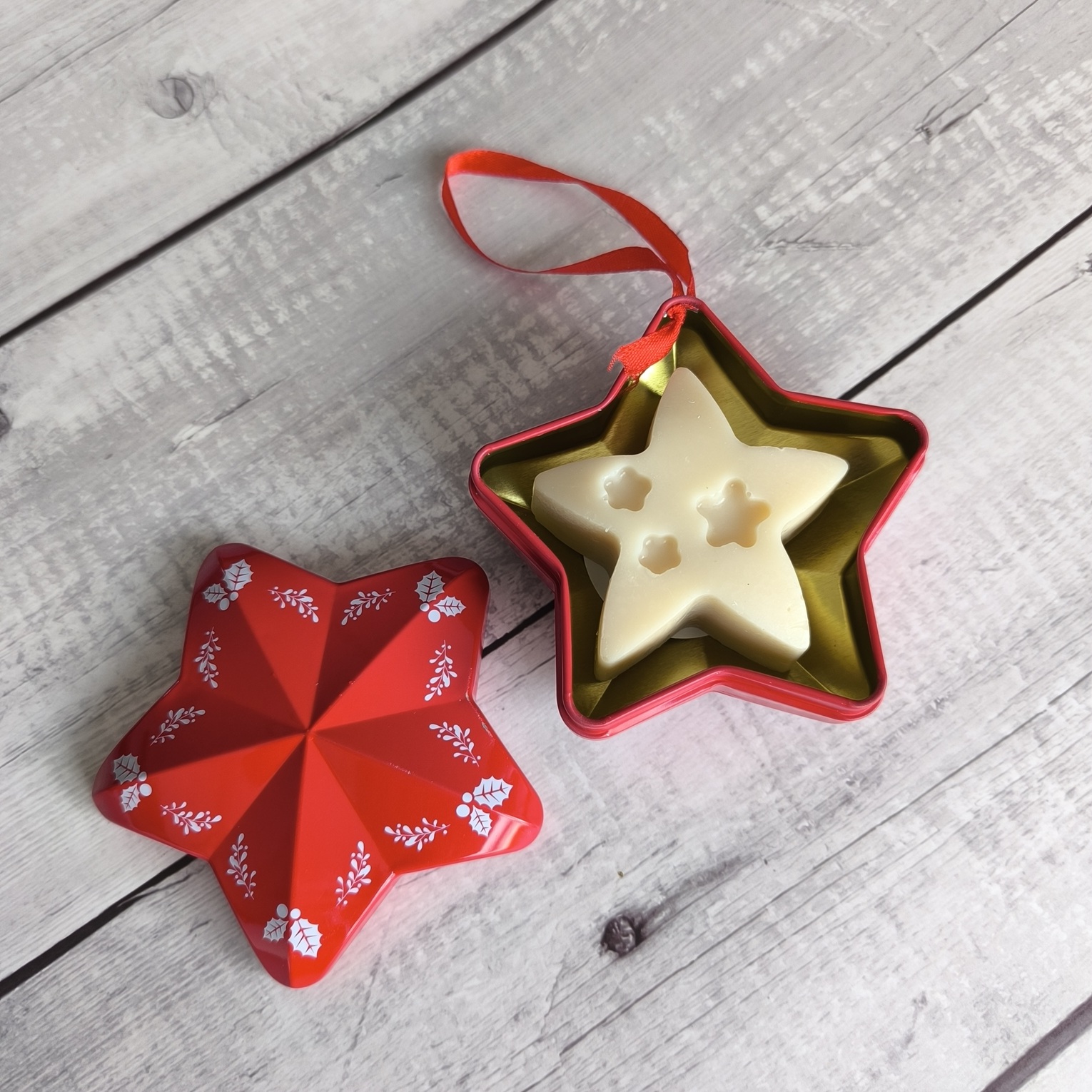 Savon biologique en forme d’étoile, avec une senteur d’arbre de Noël, dans une jolie boîte en métal qui peut se suspendre au sapin.